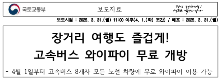 □ 국토교통부(장관 박상우)는 고속버스 이용 편의성을 개선하기 위해 4월 1일부터 전국 고속버스 내 무료 와이파이(Wi-Fi) 서비스를 제공한다.