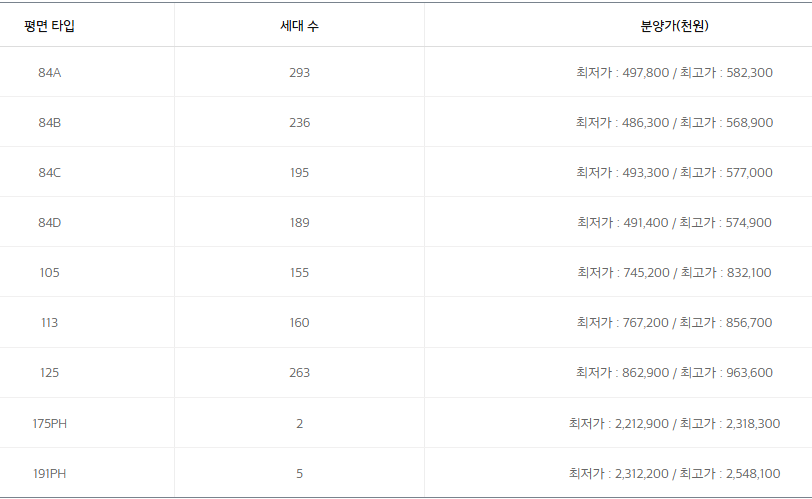 일반분양 가구수는 △84㎡A 293가구 △84㎡B 236가구 △84㎡C 195가구 △84㎡D 189가구 △105㎡ 155가구 △113㎡ 160가구 △125㎡ 263가구 △175㎡PH 2가구(펜트하우스) △191㎡PH 5가구(펜트하우스) 등 희소성 높은 중대형으로만 이뤄진다.